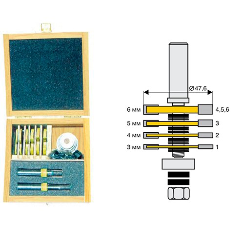 В комплект входят 6 фрез, 2 хвостовика с посадкой 12 мм длиной 67 и 79 мм, 4 подшипника диаметром 22, 25.6, 28.6, 35 мм, 8 шайб-вставок толщиной 1.6 мм, 32 шайбы-вставки толщиной 0.1 мм.