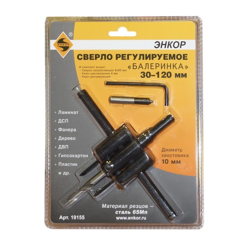 Сверло регулируемое «Балеринка» предназначено для высверливания круговых отверстий больших диаметров (30 - 120 мм) в таких материалах как ламинат, ДСП, фанера, дерево, ДВП, гипсокартон, пластик и др. В комплекте с «Балеринкой» идет шестигранный ключ для регулировки положения резцов относительно направляющего сверла и керн центрирующий. Материал резцов – сталь 65 Mn.