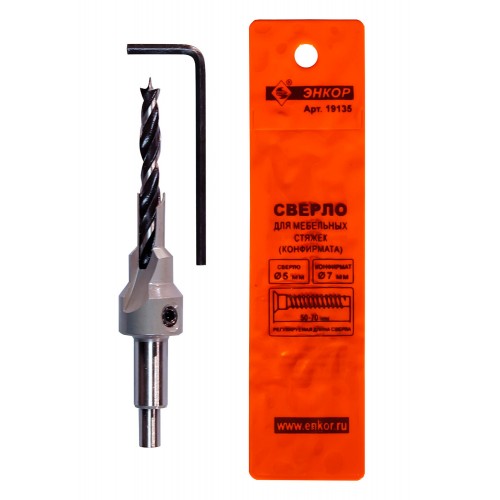 Предназначено для сверления отверстий под мебельную стяжку "конфирмат" за один проход в дереве и ДСП. Обеспечивает зенкование под потайную шляпку. В комплекте со сверлом идет шестигранный ключ для регулировки длины сверла.