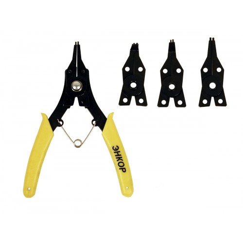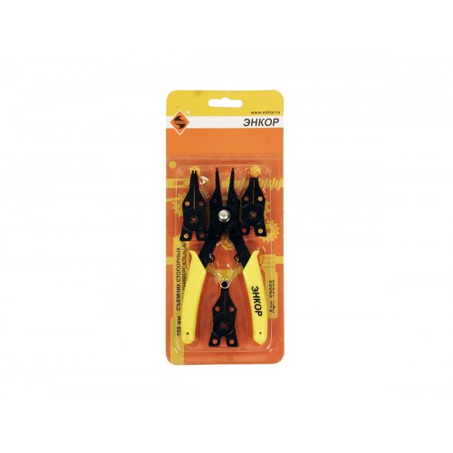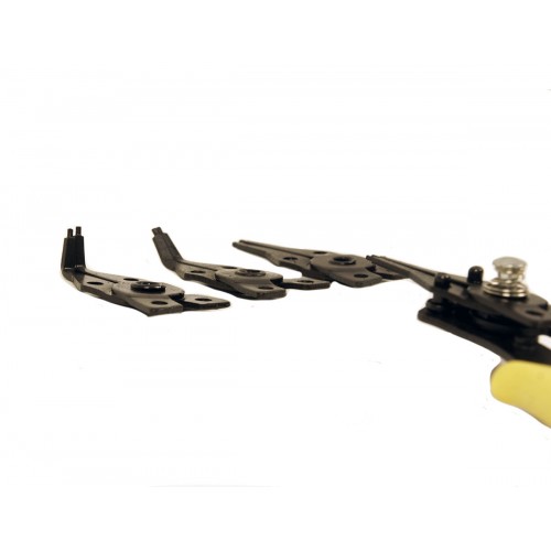 Универсальный съемник для стопорных колец длиной 150 мм, со сменными насадками предназначен для снятия внутренних и внешних стопорных колец на валах диаметром от 10 до 50 мм.  Прорезиненые рукоятки для удобства работы.  Четыре сменные насадки имеют разное положение наконечников: