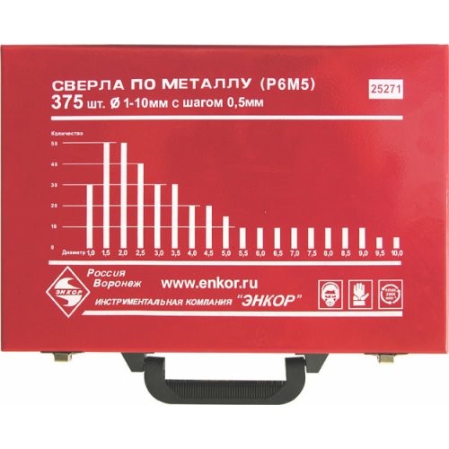 Набор сверл для металла Р6М5 1-10 мм, шаг 0,5 мм, 375 штук, металлический футляр